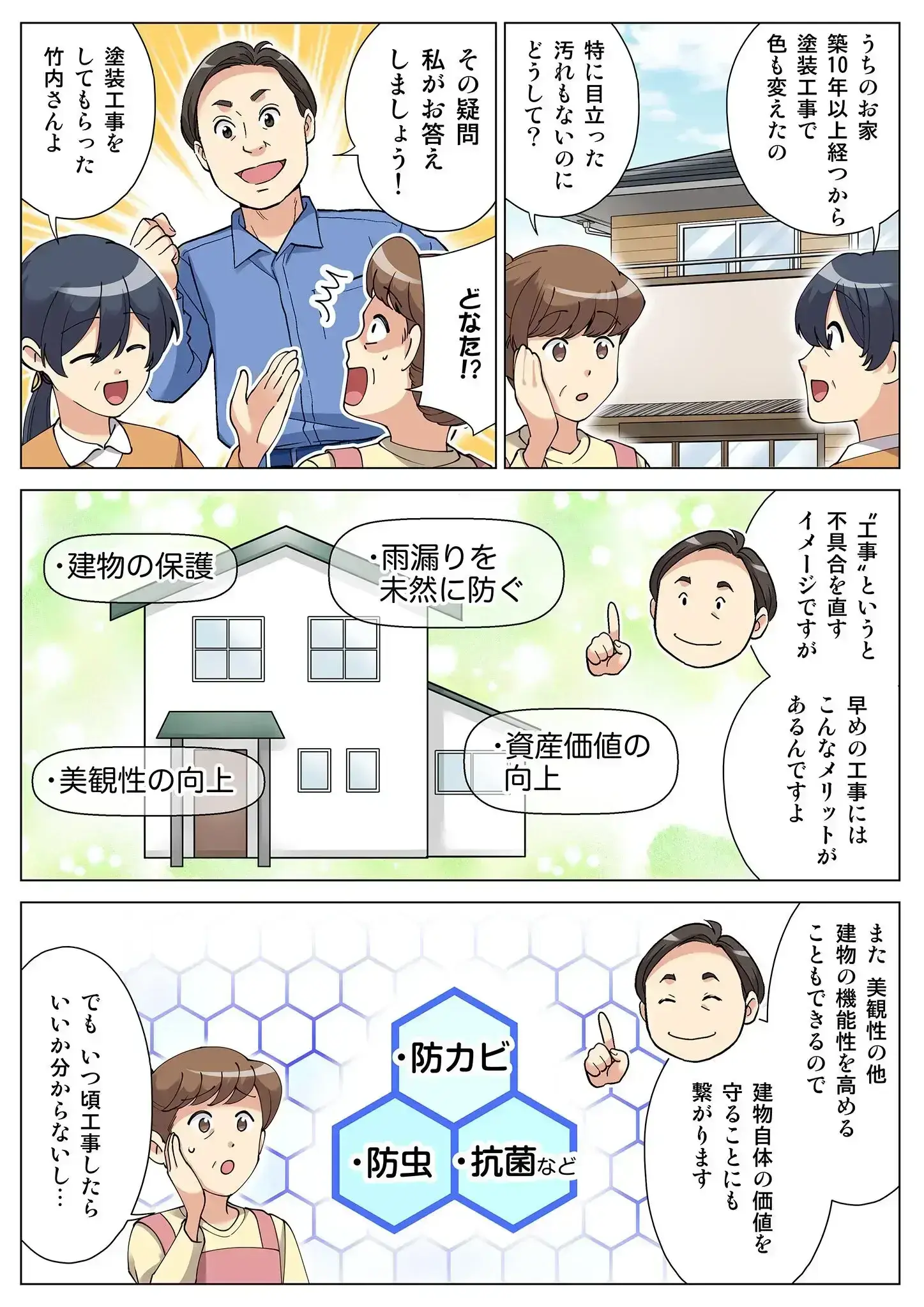 外壁塗装により新築並みの美観を取り戻せます。同時に、防カビや防虫、抗菌などの性能を向上させることも可能です。定期的なメンテナンスは、建物の価値の向上にもつながります。